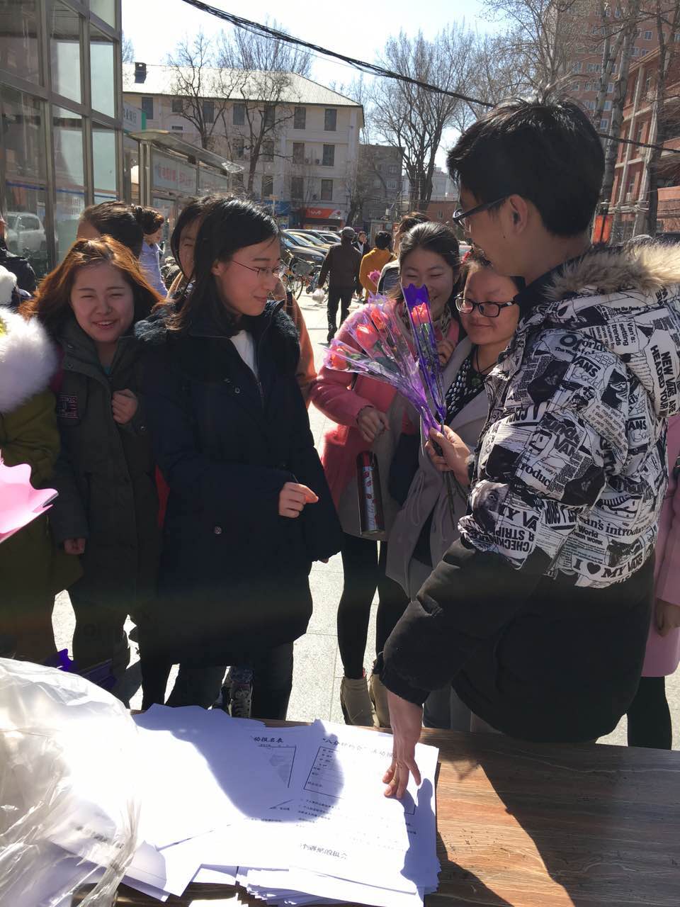 2016年3月7日,在永利yl23455西区旧食堂门口,校学生会女生部部长李释心指导举办了女生节送花活动。